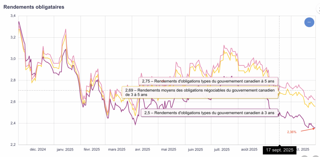 Le 29 octobre, la Banque du Canada a abaissé son taux directeur de 0,25 %, atteignant ainsi son plus bas niveau depuis 2022.